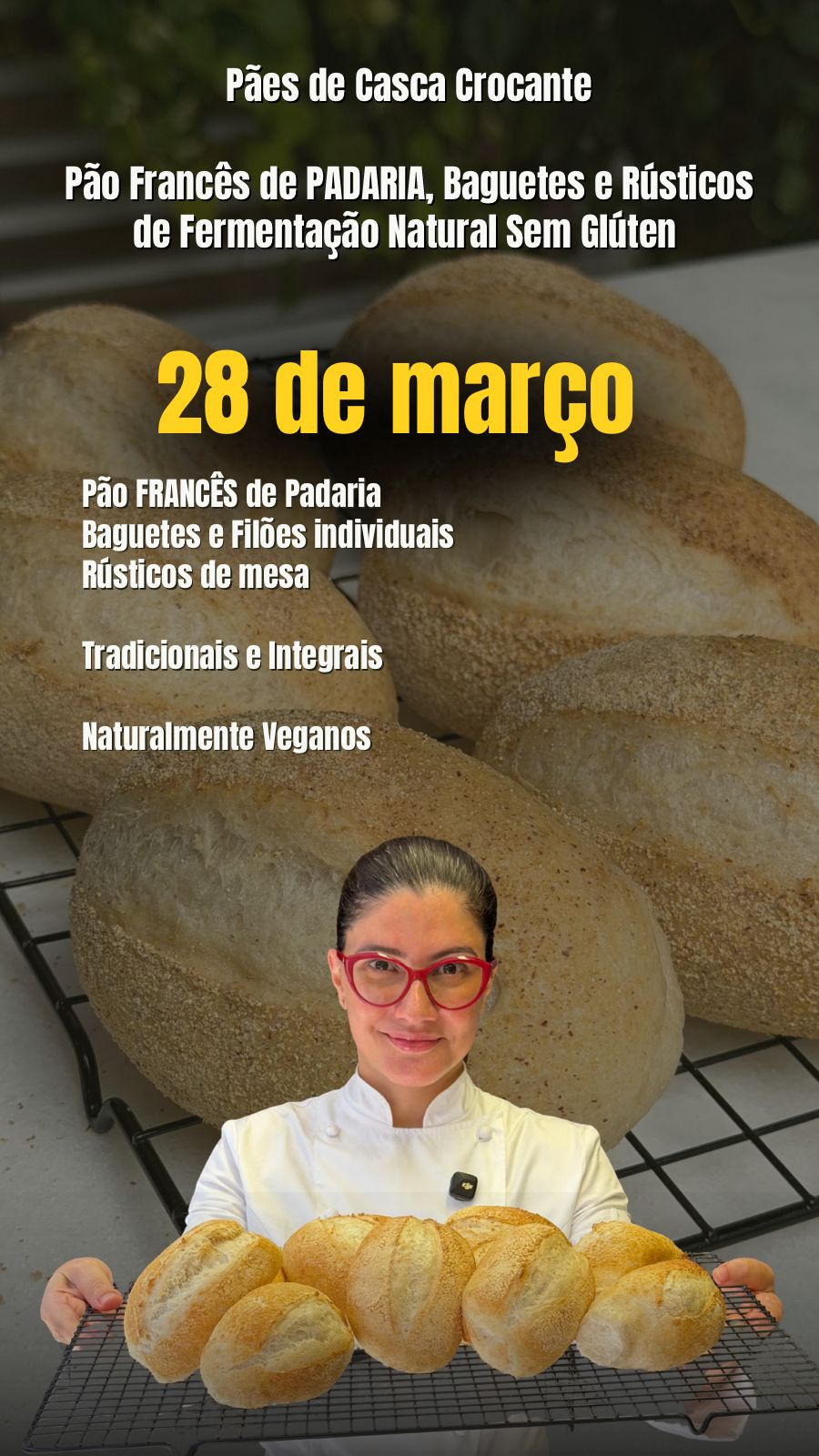 A Chef Cris Gutierrez irá conduzir você por uma experiência completa no universo sem glúten — com técnicas, receitas e orientações práticas para o dia a dia.